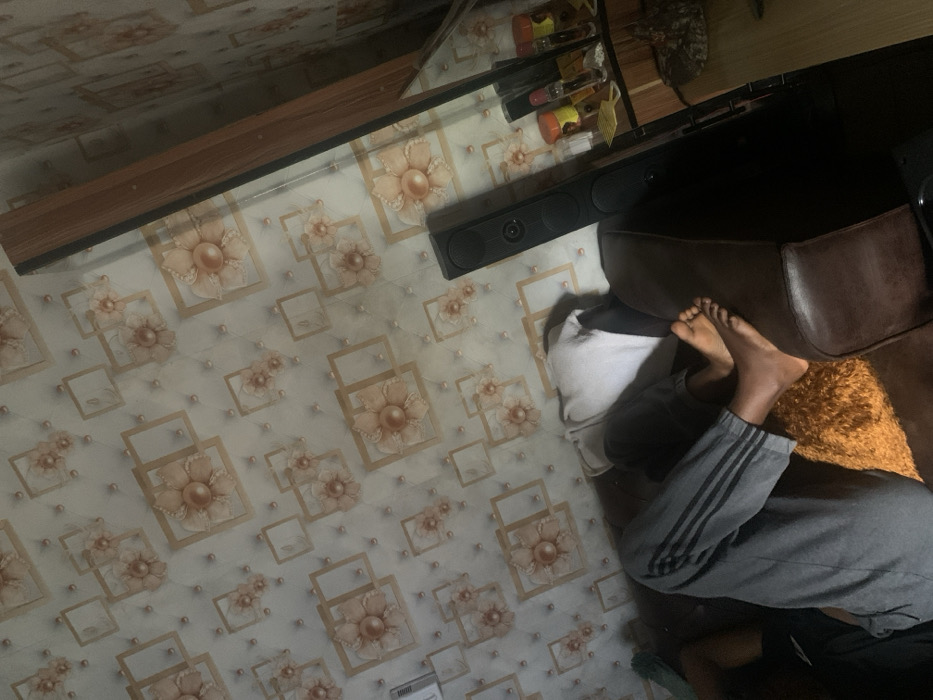 The image depicts an indoor residential scene within a structure located in Takau, Nigeria. The room's walls are covered with patterned wallpaper, featuring light-colored, square-framed floral motifs with a central round element, set against a lighter background with a subtle tufted texture. In the foreground, the lower body of an individual, wearing grey tracksuit bottoms with three black stripes on the outer seams, rests on a brown leather or faux leather sofa. The individual's bare feet are visible, positioned over an orange-brown textured cushion. Further along the sofa, a portion of a human form is present, partially obscured by white fabric. To the right of the sofa, a tall, black tower speaker stands vertically. Adjacent to the speaker, a narrow, dark-framed vertical mirror is mounted. Below the mirror, a light-colored wooden shelf holds several items, including multiple small bottles, some containing colored liquids, and a small, dark, textured decorative object.