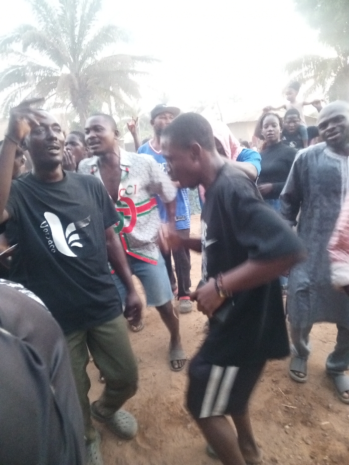 A group of people are gathered outdoors, seemingly celebrating. Several individuals are dancing, and others are observing. The environment appears to be a village or rural area, with a dirt ground and some trees visible in the background. Most of the people are dressed in casual clothing, and the atmosphere is lively and joyful.
