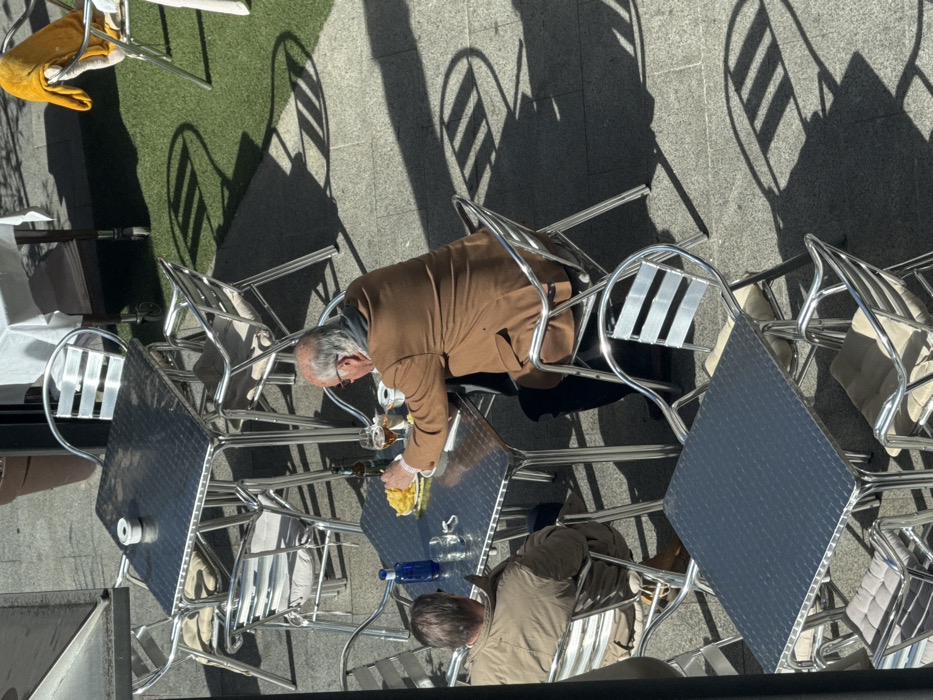 - "An overhead view captures an outdoor cafe patio in les Escaldes, Andorra, under strong sunlight" by FM-qzRJ63, licensed under CC BY 4.0