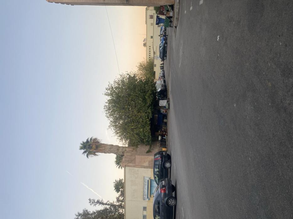 A street scene shows parked cars, a palm tree, and a large leafy tree. The street stretches into the distance with stalls or shops lining one side. Buildings are visible in the background. The sky is clear and blue, with a light gradient towards the horizon. The photograph appears to be taken during the day.