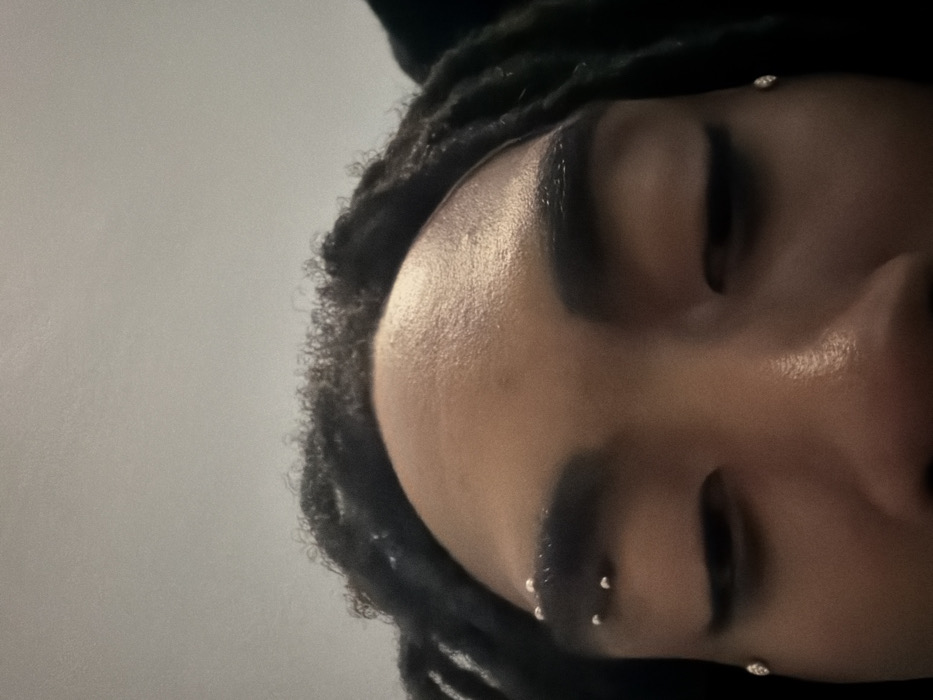 close-up view of a person's face from a low angle. The person has dark skin, dark hair styled in locs, and closed eyes. There are a few small, shiny studs or piercings visible on the forehead and near the nose. The skin appears smooth and slightly shiny. The background is a plain, light gray color, creating contrast with the subject's darker features.