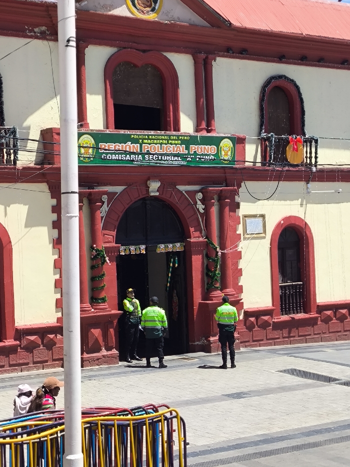 The image displays the exterior of the "Región Policial Puno, Comisaría Sectorial "El Puno"" police station, located in Puno, Peru