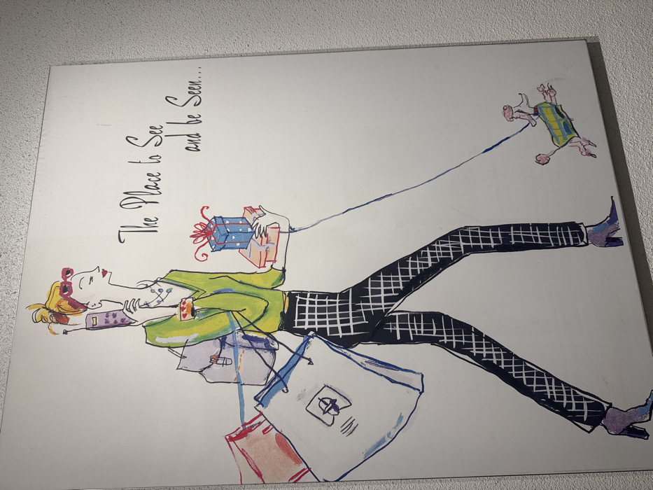 An illustrative artwork is mounted on a light-colored, textured wall in Bal Harbour Village, United States of America. The artwork depicts a stylized, slender woman in profile, walking towards the right side of the frame. She has blonde hair tied up, red-framed sunglasses pushed onto her head, and prominent red lipstick. Her attire includes a light green long-sleeved top, dark pants with a white grid pattern, and pointed-toe, bluish-purple high-heeled boots. The woman is engaged in multiple actions: her right hand holds a purple, older-model cellular phone to her ear. Her left arm is laden with various items: a large white shopping bag featuring a dark blue logo (resembling a stylized 'B'), a smaller red-orange bag, and a light purple backpack slung over her shoulder. Her left hand also carries a stack of three gift boxes, with the topmost being a blue box adorned with white polka dots and a red bow, resting on two smaller rectangular boxes (one pink, one beige). A thin blue leash extends from her left hand downwards. Following the leash, a small, stylized pink dog, wearing a green and yellow plaid coat, walks alongside the woman, also facing right. To the right of the woman, handwritten-style text reads: "The Place to See and be Seen...". The wall behind the artwork is a textured, off-white or light beige surface.