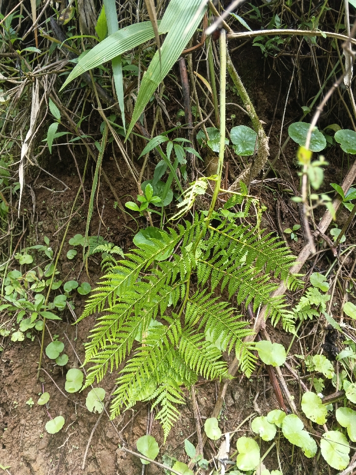 A close-up depicts a lush scene of vegetation. A vibrant green fern dominates the center, its delicate fronds spread wide. Circular, penny-like leaves of another plant cluster around the fern and along the bottom of the frame. Other green plants with varied leaf shapes intertwine with dried stems and roots against a backdrop of earthy soil. Bamboo-like leaves also appear within the plants. The shot provides a detailed view of undergrowth.
