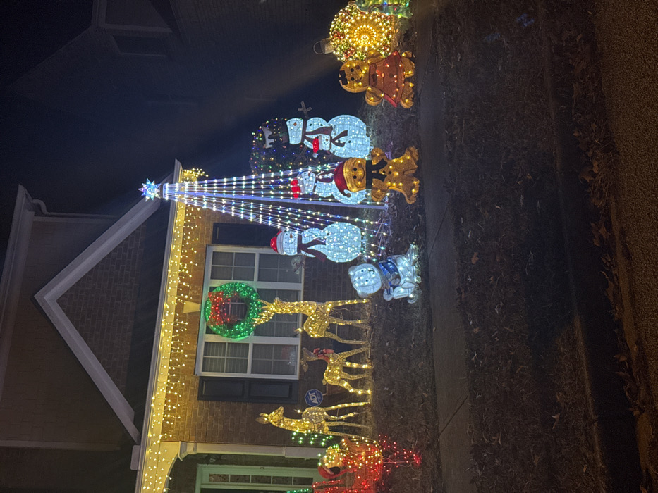 A two-story brick house is decorated for Christmas. Strings of lights line the roof. A wreath adorns the window. Lighted reindeer stand on the lawn. A light display resembling a Christmas tree is constructed with cascading lights. Snowmen and gingerbread men lights are also present, along with a polar bear on a scooter. A large globe of lights sits at the far end of the yard.