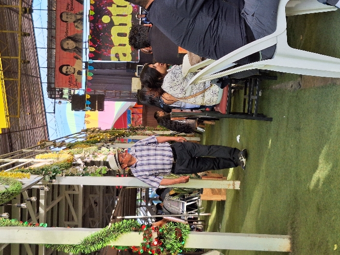 n outdoor dining area in Socabaya, Peru, located at the coordinates -16.459 latitude and -71.545 longitude. The scene features a man in a plaid shirt and hat walking towards the right edge of the frame. Behind him, several people are seated at tables in the outdoor dining area, with green artificial turf covering the ground. The people are interacting with each other and dining. There are several white plastic chairs and black metal tables. The dining area is under a metal roof structure decorated with greenery. In the background, a large sign displays an image of a band, likely advertising an upcoming performance. The scene suggests a casual and festive atmosphere.