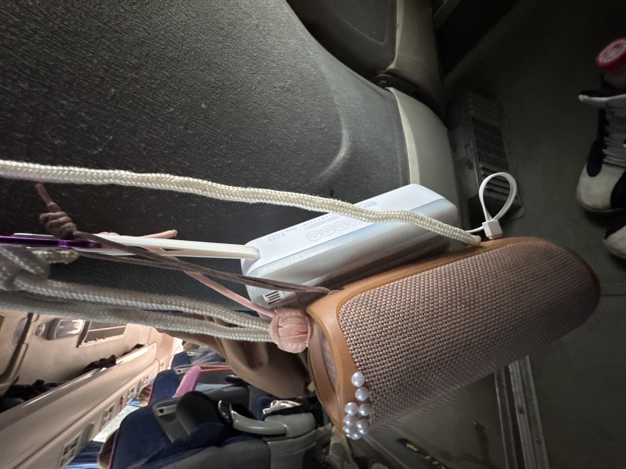 The image appears to be taken inside an airplane cabin. Predominantly visible are parts of the airplane seat, specifically the grey headrest and the seat itself. Also in view is the airplane interior, including the overhead bins and seating. A portable charger and a speaker are suspended by what appears to be ropes or cords. A pair of shoes is visible in the background. The image is taken at an unusual angle. There is no information that this image was taken in Krylovo, Russia.