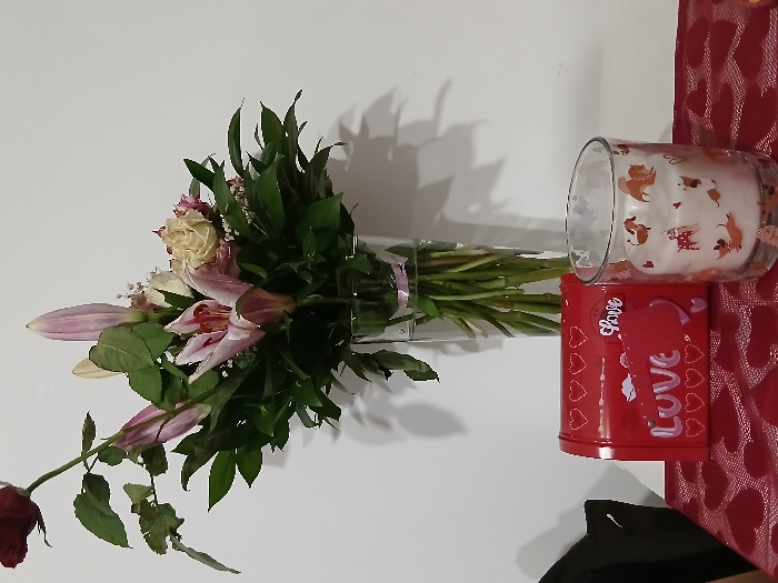 A bouquet of lilies, roses, and greenery sits in a glass vase. To the right, a red tin with the word "Love" and a heart design is topped with a candle featuring dog illustrations. The arrangement is displayed against a white wall, with a red tablecloth adorned with hearts visible in the background.