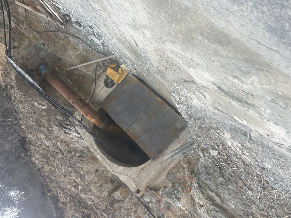 This image captures a construction or infrastructure installation site in Erma Reka, Bulgaria, centered on a tunnel entrance into a steep, rocky hillside. The tunnel, appearing circular and concrete-lined, features a large, rusty, brown metal pipe emerging from its interior and extending downwards at an angle towards the right. This pipe has a blue cap or fitting on its visible end outside the tunnel. A dark grey, rectangular metal structure, possibly a cover or access panel, is positioned over the lower section of the tunnel opening. Multiple black electrical cables run along the hillside and near the tunnel entrance, with some routed over a corrugated metal sheet acting as a partial overhead cover. To the right of the metal structure, a crumpled yellow tarp or fabric is visible on the ground, alongside a scattered pile of wooden planks and debris. The ground in the foreground and lower right consists of gravel and dirt, forming a sloped path or work area, with evidence of moisture and uneven terrain. The upper background reveals a rocky, treeless slope with bare deciduous branches under an overcast sky. No individuals are present in the scene.