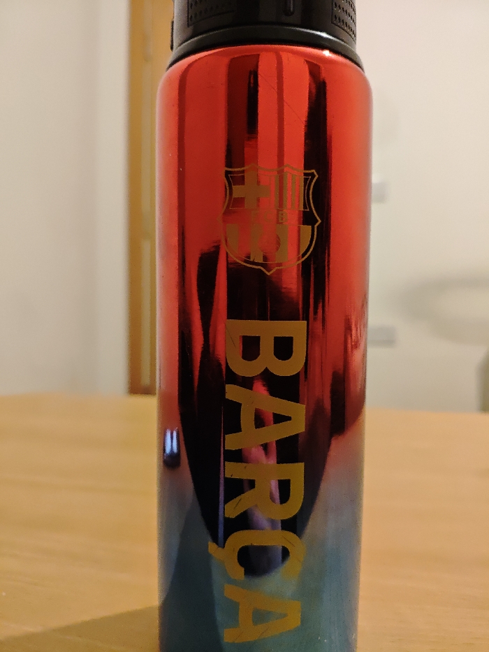 A vertically oriented image displays a metallic water bottle standing on a light-colored wooden table. The bottle exhibits a reflective, gradient finish, transitioning from red in its upper section to a darker, possibly bluish-green hue towards the base. A black, textured cap seals the top. Gold-colored branding on the red portion includes an emblem identifiable as the FC Barcelona crest, positioned above the vertically oriented word "BARÇA". Fine scratches are visible on the bottle's reflective red surface. The background consists of a plain, light-colored wall. No individuals, specific actions, or interactions are present. The scene is indoors; however, the image itself contains no visual information to confirm a location in Swindon, United Kingdom.