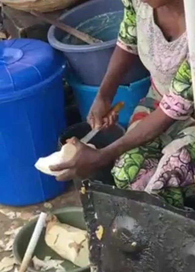 woman preparing food at what appears to be a market stall. She is seated and using a knife to cut a large white piece of food into smaller pieces. She then drops the pieces into a pot of hot oil, which is being heated by a wood fire. There are several other people around the stall. Some appear to be customers, while others may be vendors at nearby stalls. There are buckets of various items surrounding her, including what appears to be raw produce and fried foods.