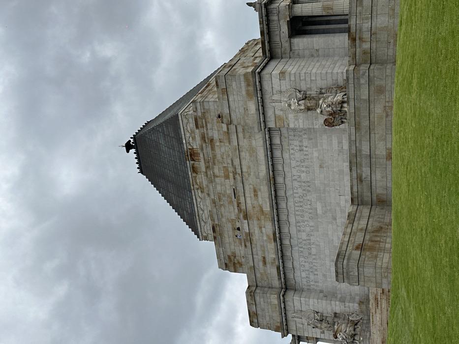 partial view of a stone monument beneath a cloudy sky. The building is constructed of large, rectangular blocks of stone. Inscribed vertically on one section are the words "ELECTED BY A GRATEFUL". Additional words include "SERVE VICTORIA", "MONUMENT WAS" and "EMPIRE". Carved sculptures adorn the surface. Lush green grass fills the right side of the view. At the apex of the monument, a black, bird-like statue stands guard.