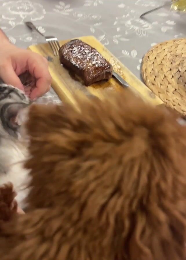 The scene shows a rectangular cut of meat, likely beef, sitting on a small, rectangular wooden cutting board, in the center of a table set for a meal. To the right of the cutting board, there is a round, woven straw mat, topped with what appears to be a small ceramic pot. A knife and fork rest on the cutting board, next to the meat. Two people's hands are visible, one on either side of the cutting board. To the left, there is a cat, its face turned toward the meat. In the foreground, a fluffy brown dog is present, with its fur partially obscuring the view. The table is covered with a patterned gray and white tablecloth. A person can be partially seen seated at the table in the background. A glass of liquid is also visible on the table.