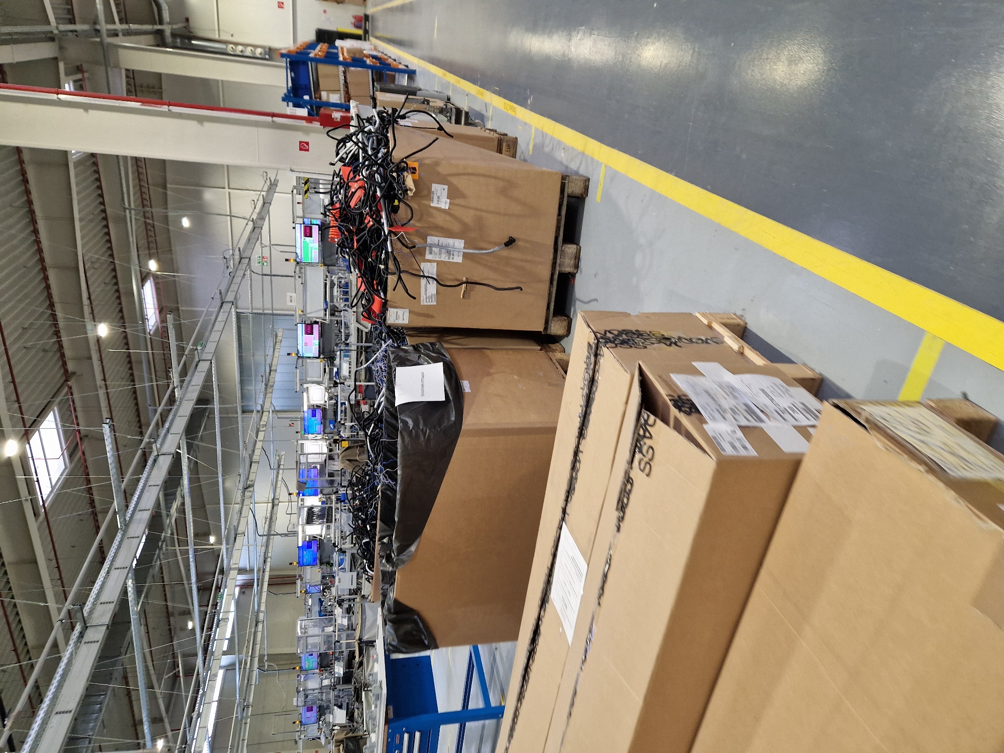 interior of a large warehouse or industrial facility, possibly in Bahovitsa, Bulgaria, though there is no direct evidence of this in the picture. There are numerous rows of what appear to be computer stations along the left side, each with a monitor displaying a screen. Stacked boxes and packaging materials are situated in the foreground and along the right side of the image. These boxes seem to be placed on pallets. Cables are draped over some of the boxes. A yellow line runs along the floor, marking a walkway or boundary. The facility is well-lit with overhead lighting, and the ceiling is high with visible support structures and ventilation systems. There are no people visible in the picture.