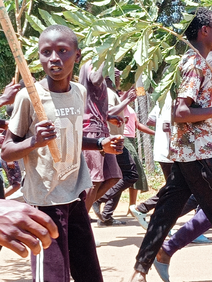 This image captures an outdoor scene featuring a group of individuals, predominantly young males, in Lumakanda ward, Kenya, under bright daylight conditions