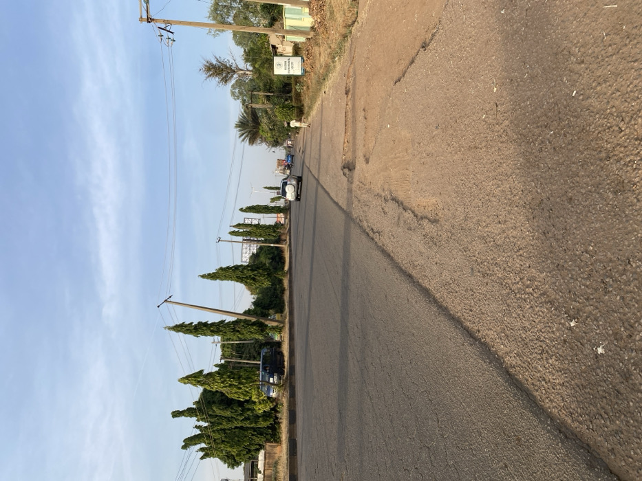 An outdoor scene depicts a multi-lane asphalt road under a light blue sky with wispy clouds, located in Television, Nigeria. The road, showing signs of wear and cracking, extends into the distance, appearing empty in the foreground. A distinct, uneven dirt and gravel shoulder, marked by potholes and eroded sections, borders the right side of the road. On the left side of the road, a concrete curb separates the asphalt from a verdant median or embankment densely populated with numerous tall, slender, conical evergreen trees. A dark-colored minivan is parked amidst these trees on the left. Several utility poles with overhead lines are positioned along both sides of the road, with some exhibiting a noticeable lean. A large billboard structure is partially visible in the mid-ground on the left. On the road itself, a white SUV travels away from the viewer in the right lane, while other vehicles are visible as indistinct shapes further in the distance. A single individual walks away from the viewer on the right shoulder, carrying an object on their head. Near this individual, a white sign with blue text is erected, displaying what appears to be "NIGERIAN ENVIRONMENTAL SOCIETY" or similar text. Structures with faded paint are visible behind this sign and further down the right side of the road. Shadows indicate a low sun angle, suggesting either early morning or late afternoon.