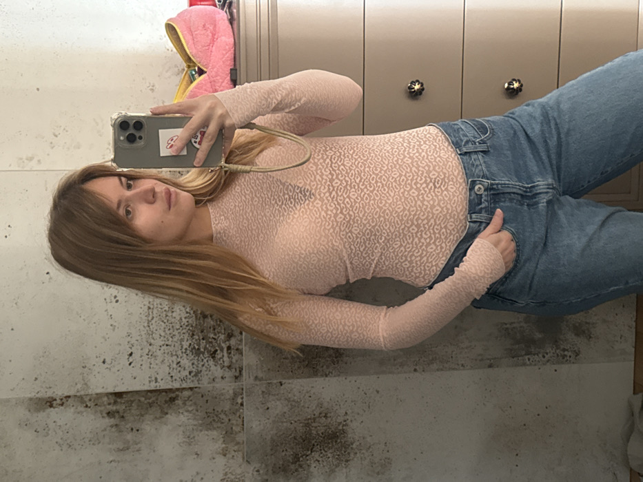 This image depicts an adult female posing for a mirror selfie indoors, within the city of Hrodna, Belarus. The subject has medium-length light brown hair with lighter highlights and is observed with a neutral expression, looking slightly to her left. She is wearing a sheer, light pink, long-sleeved top with a subtle all-over pattern, beneath which a dark-colored bra is visible. Her lower garment consists of blue denim jeans, with her left hand partially inserted into the front pocket. Her right hand holds a smartphone, encased in a clear protective cover with a wrist strap attached, and a red and white sticker is affixed to the phone's back. The background features a large reflective surface, possibly an aged mirror or distressed wall panels, exhibiting mottled dark and light gray textures. To the subject's right, a light-colored dresser or chest of drawers with multiple drawers and decorative dark and gold-toned knobs is visible. A bright pink, quilted pouch with a yellow zipper is positioned on top of the dresser. A light-colored fabric item is partially visible on the floor in the lower-left corner of the frame.