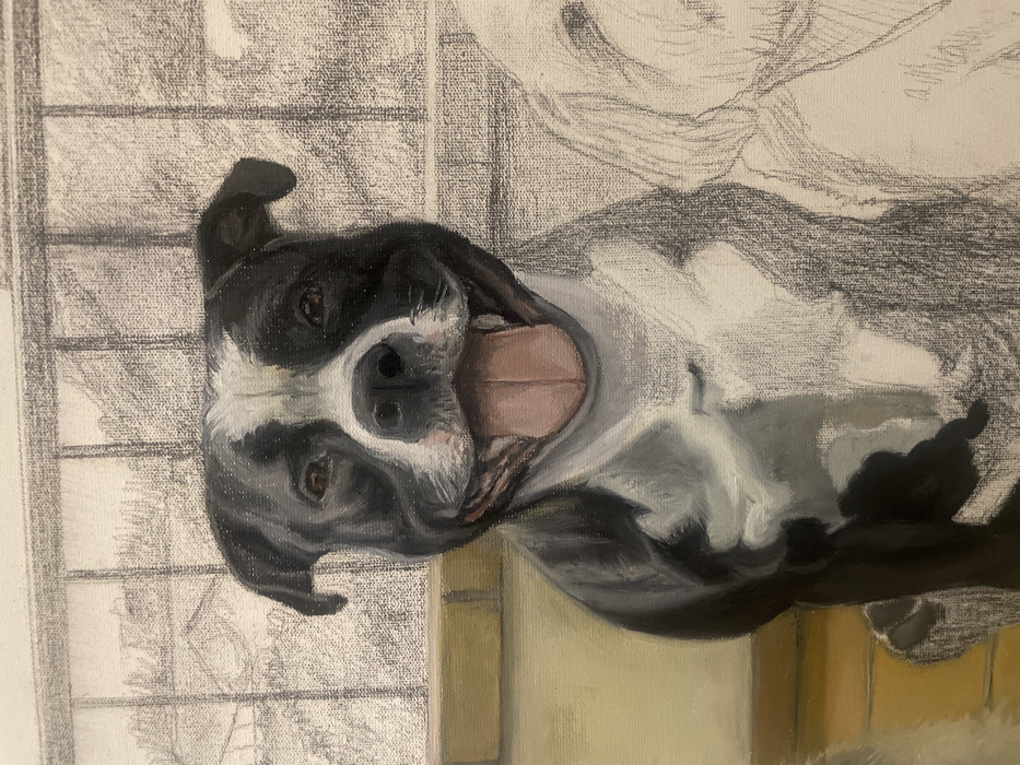This image displays a partially completed artwork, presented within the context of São Paulo, Brazil. The central subject is a black and white dog, resembling an American Staffordshire Terrier or Pitbull-type, painted in full color from the head to the mid-torso. The dog features a white muzzle, a white stripe between its dark brown eyes, and a broad white chest marking, with the remaining fur being black. Its mouth is open in a panting expression, revealing a pink tongue and subtle tooth detail. To the right, an unfinished pencil sketch outlines a second dog, suggesting lighter-colored fur, partially visible. The background consists of an uncolored pencil sketch of an interior window with a grid pattern, looking out onto an indistinct landscape featuring distant hills or structures. A painted golden-yellow horizontal surface, likely a window sill or piece of furniture, is visible to the left of the central dog. The artwork is rendered on a textured canvas, illustrating a clear contrast between the fully colored, completed sections and the detailed, uncolored pencil sketches. No human subjects are depicted.