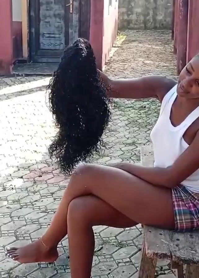 A young Black woman with short, braided hair is sitting on a weathered wooden stool in an outdoor area. She is wearing a white tank top and a plaid skirt. In her right hand, she holds a long, dark, curly wig, examining it closely. She runs her fingers through the wig, appearing to inspect the texture. The setting is a partly shaded area with patterned stone pavement, a red-painted wall, and a door visible in the background. A pair of dark sandals lies on the ground near her feet.