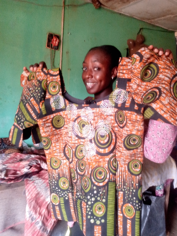 An indoor scene in the city of Unknown, Unknown, depicts a young adult female, with dark skin and short dark hair, standing centrally. She is smiling, showing teeth and dimples, and wears small silver hoop earrings. She holds up a short-sleeved garment, displaying it with both hands. The garment is made from a patterned fabric featuring concentric circles and vertical stripes in orange, dark green, black, and white. Its chest area is embellished with multiple circular designs composed of light-colored beads or sequins. The right sleeve shows a pink fabric cuff or lining with a lighter floral pattern. The background consists of a plain light green wall with a dark electrical outlet or switch, showing red components, mounted on the left. In the lower left, a stack of reddish-brown patterned fabrics is visible on a surface. A dark object, possibly a bag, and additional light fabrics are partially visible in the lower right background.