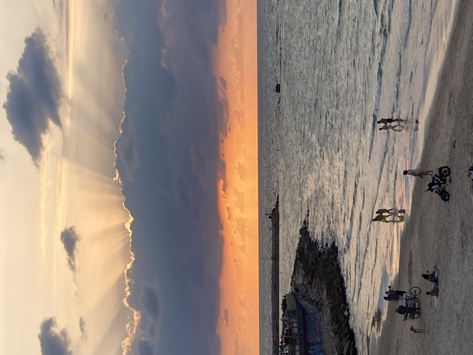 This image depicts a sunset over the Mediterranean Sea from the Jaffa coastline in Tel Aviv, Israel, likely near Charles Clore Park, looking towards Jaffa Port. The sky occupies the upper two-thirds of the frame, dominated by large, dark cumulus clouds from which brilliant golden crepuscular rays emanate upwards and outwards, illuminating the upper atmosphere. Below these clouds, the horizon glows with intense orange and yellow hues from the setting sun, which is obscured by clouds. The sea, in the mid-ground, exhibits a calm surface with gentle waves, reflecting the orange light. A long, rocky breakwater extends from the left mid-ground into the sea, curving slightly to the right, and culminates in a small, white lighthouse structure with a green light near its top. Further out in the sea, to the right of the breakwater, a dark, isolated rock formation or structure is visible. On the left side of the image, an elevated concrete promenade or retaining wall, partially covered with graffiti at its base, borders the beach. Numerous indistinct individuals are visible along the top of this promenade, gathered and observing the sunset. Several parked vehicles are partially visible on the elevated surface behind the wall. The sandy beach occupies the lower third of the image. The sand near the water's edge is wet and reflective. On the wet sand, two pairs of individuals are present: one pair (an adult male and female) walks towards the right in shallow water, while another pair (an adult male and female) walks towards the left, further into the water. A single adult female stands on the wet sand, facing left. On the drier sand in the foreground, two individuals are seated on a blanket. To their left, an adult stands beside a two-wheeled cart featuring a large umbrella, with a small tan dog positioned nearby. A black electric bicycle or scooter with thick tires is parked on the sand in the right foreground.