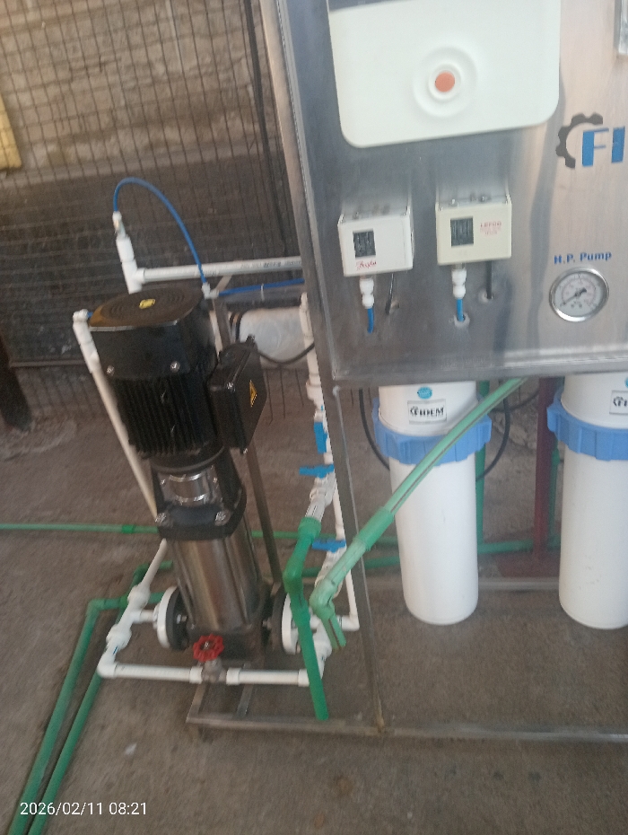 A water filtration system features a pump with a black motor and silver cylindrical body. It is connected to a network of white and green pipes, valves, and fittings. The system also includes two white filter housings with blue caps, mounted on a stainless steel panel. The panel has pressure gauges and electronic components. A date of "2026/02/11 08:21" is visible in the bottom left corner, likely from a camera's timestamp.