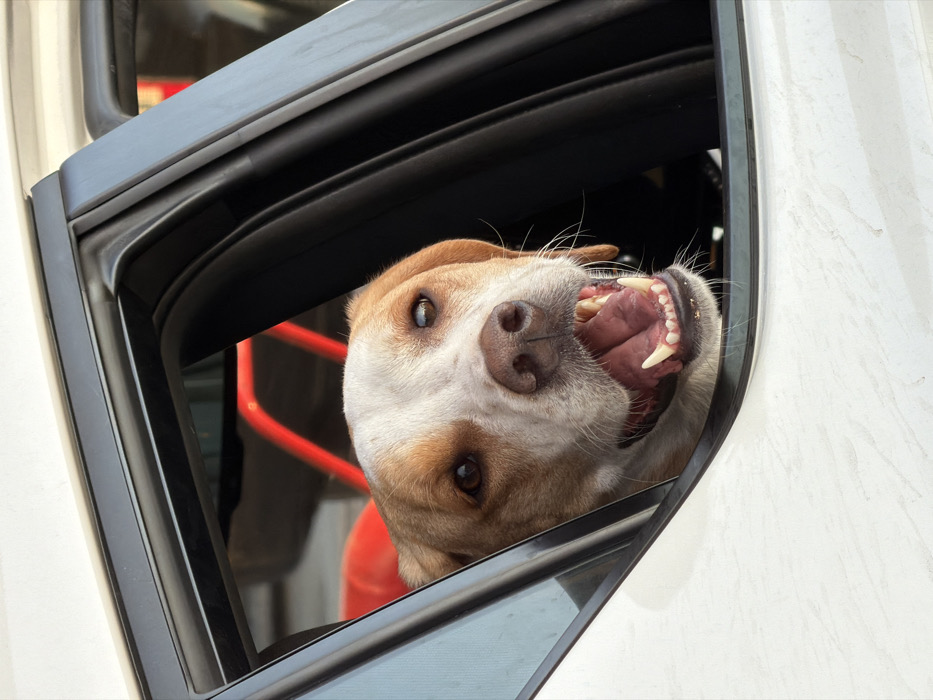 - "A bi-color canine, primarily white with tan and brown markings on its face and ears, is depicted looking out of the partially lowered window of a white passenger vehicle" by FM-mkWXI3, licensed under CC BY 4.0