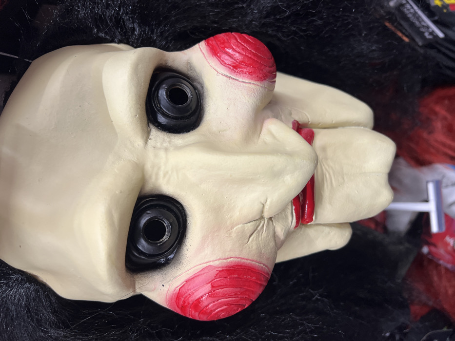 - "A close-up, head-on view captures a mask or doll's head, visually consistent with the character 'Billy the Puppet' from the *Saw* film franchise" by FM-RPGCC2, licensed under CC BY 4.0