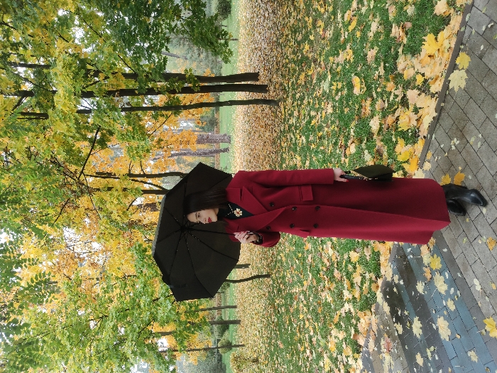 A full-length, eye-level photograph captures a solitary woman standing on a paved walkway within a park or garden in Kyiv, Ukraine, during autumn. The woman is positioned slightly to the left of the frame, facing a three-quarter profile to her left. She wears a long, double-breasted dark red (burgundy) coat that extends to her ankles, beneath which a black high-neck garment is visible. Black pointed-toe heeled boots are on her feet. A prominent, gold-toned, ornate brooch or pendant is affixed to her chest. Her dark hair is styled around her shoulders, and she has red lipstick applied. She holds an open black umbrella directly above her head with her right hand. In her left hand, she carries a small black handbag featuring a gold-toned chain strap. The immediate foreground consists of grey interlocking pavers. Adjacent to and beyond the walkway, green grass is densely covered with numerous fallen yellow leaves. The background comprises several deciduous trees exhibiting a mix of yellow and green autumn foliage. The ambient light suggests an overcast outdoor setting.