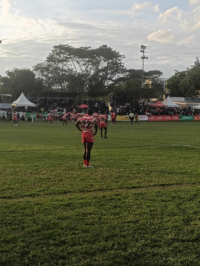 The image captures an outdoor rugby event at the RFUEA Grounds on Ngong Road, Nairobi, Kenya, during the late afternoon or early evening under a partly cloudy sky