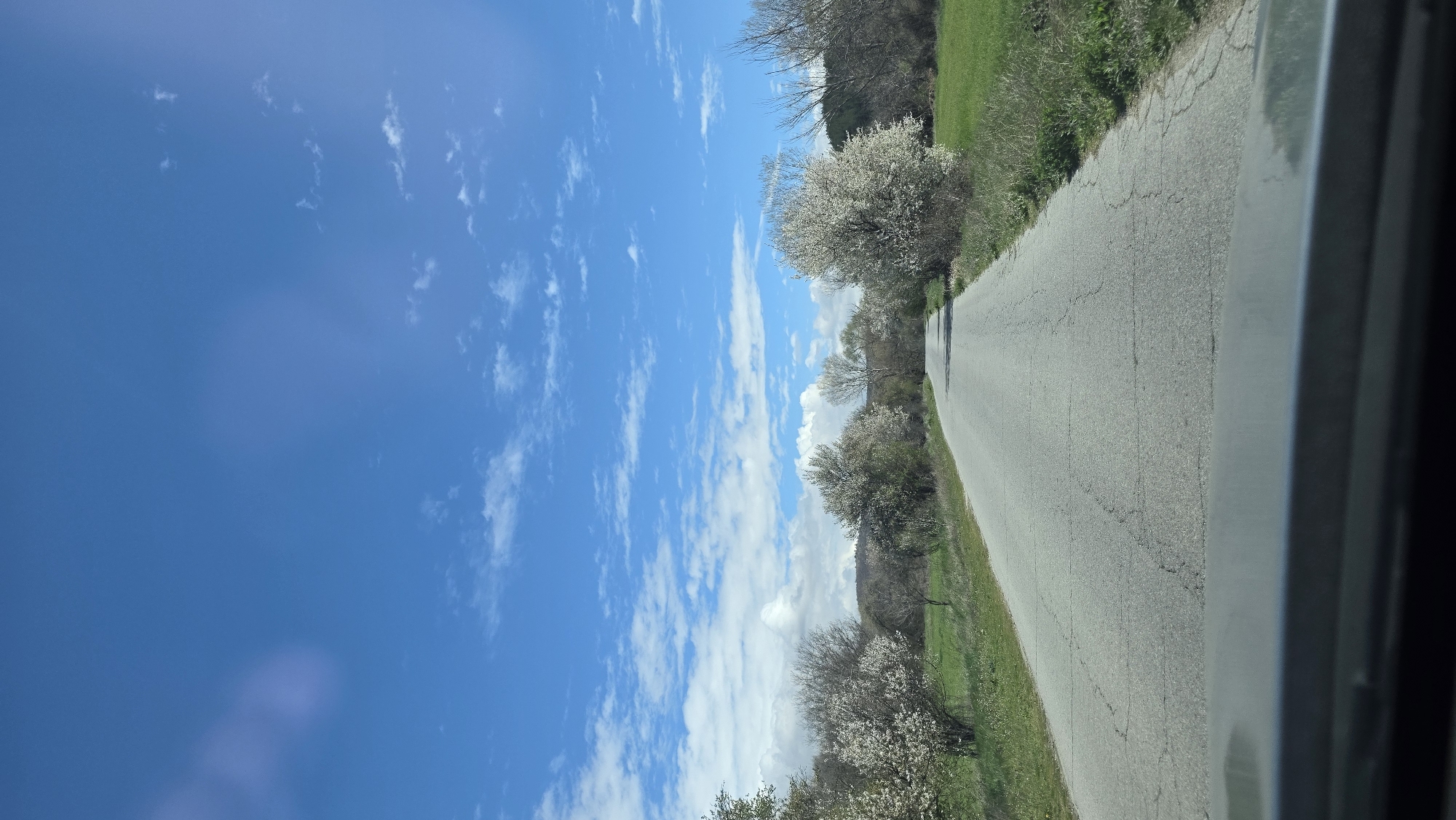 A road stretches into the distance, flanked by trees in bloom and a vibrant green field. The sky overhead is a bright blue, dotted with white clouds. The image is taken from inside a vehicle, as evidenced by the car window visible on the right. There is no information to indicate the location is Slatino, Bulgaria.