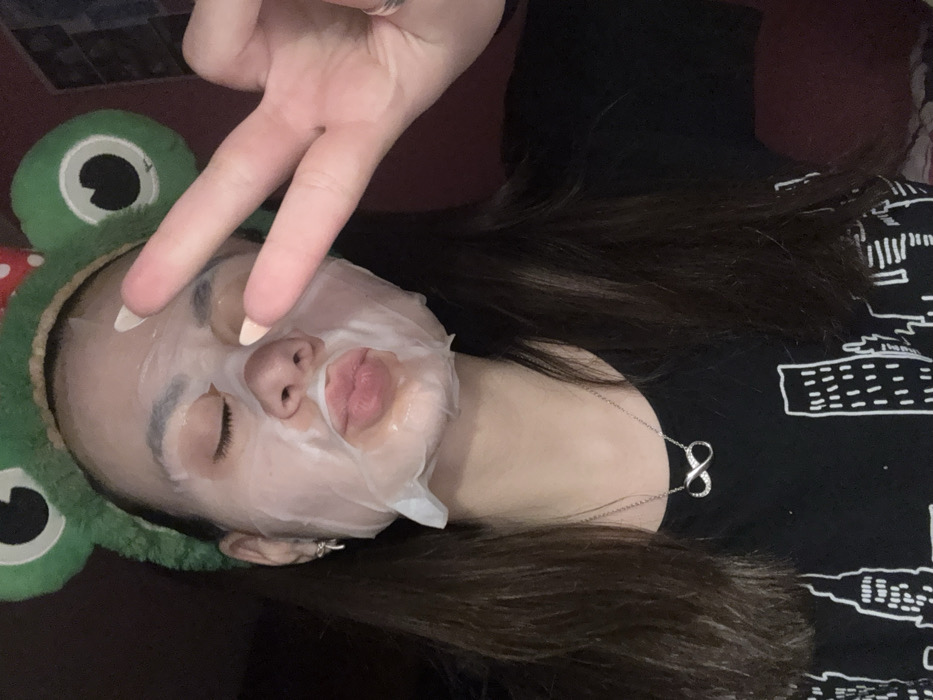 The image displays a close-up portrait of a female individual in an indoor setting. She has dark brown hair styled into two visible sections, possibly pigtails, and is wearing a green plush headband with large white and black frog-like eyes, along with a red and white polka dot element near the right eye (viewer's left). A translucent sheet face mask covers her entire face, leaving cutouts for her eyes, nose, and mouth; her eyes are closed, and her lips are pursed. Her left hand is raised to the right side of her head (viewer's right), forming a "V" sign with her index and middle fingers. Her fingernails are manicured with a light base color and white tips. A metallic ring is visible on her left ring finger. She wears a silver-colored necklace with an infinity symbol pendant adorned with small clear stones, and small silver-colored hoop earrings. Her clothing consists of a black short-sleeved t-shirt with a white graphic outline print depicting a city skyline. The background is dark and out of focus, providing no specific environmental details. The city of Radomir, Bulgaria, is not visually discernible within the image.