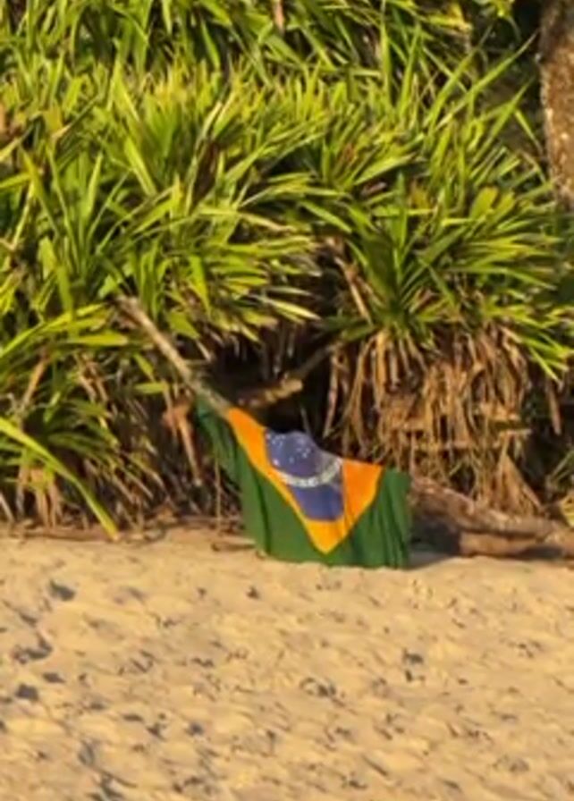 The camera is static, capturing a beach scene with a Brazilian flag draped over a tree branch next to a patch of spiky green plants