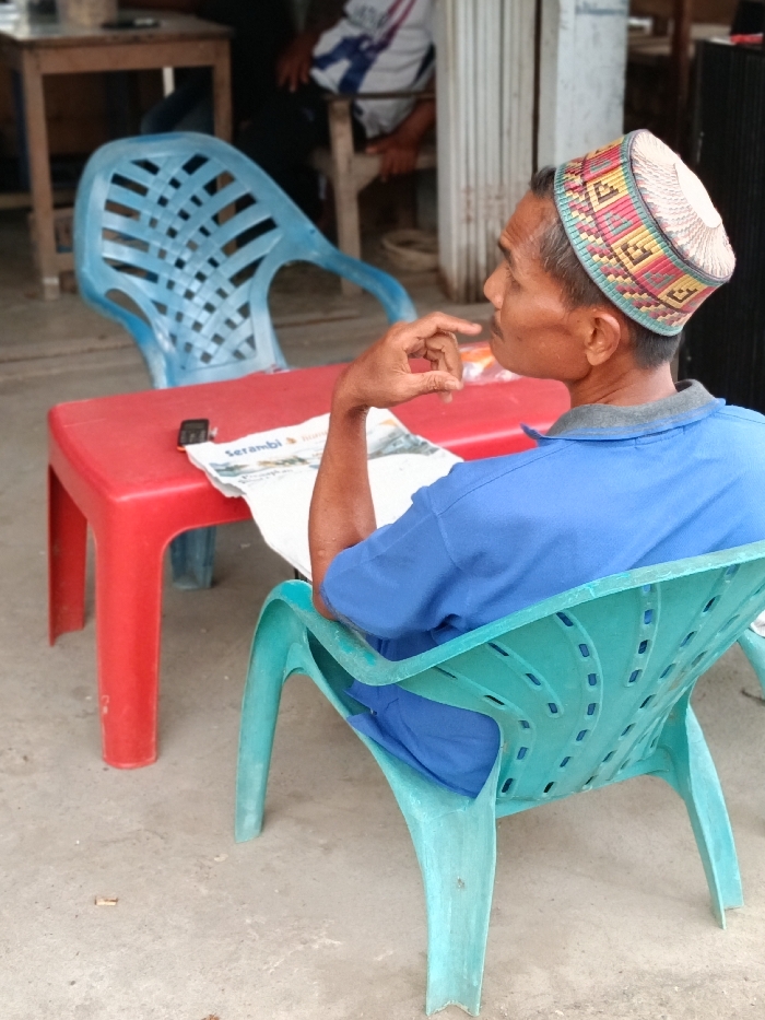 A male individual is observed seated outdoors in Blangkutacoh, Indonesia. He wears a blue short-sleeved polo shirt with a grey collar and a multi-colored woven cap adorned with geometric patterns. The man is seated on a teal-colored plastic chair, positioned with his back partially to the camera, and his gaze directed towards the right side of the frame. His right hand is raised, with fingers near his chin in a contemplative posture. To his immediate left is a red plastic table. Resting on this table is a folded newspaper, with the word "Serambi" clearly visible on its masthead, alongside a small black rectangular object, likely a mobile phone. Behind the red table, an unoccupied light blue plastic chair with a similar lattice design is present. The ground is concrete. In the blurred background, a person wearing a white and blue patterned shirt is partially visible, seated at a wooden table with wooden chairs, suggesting an adjacent indoor or shaded area.
