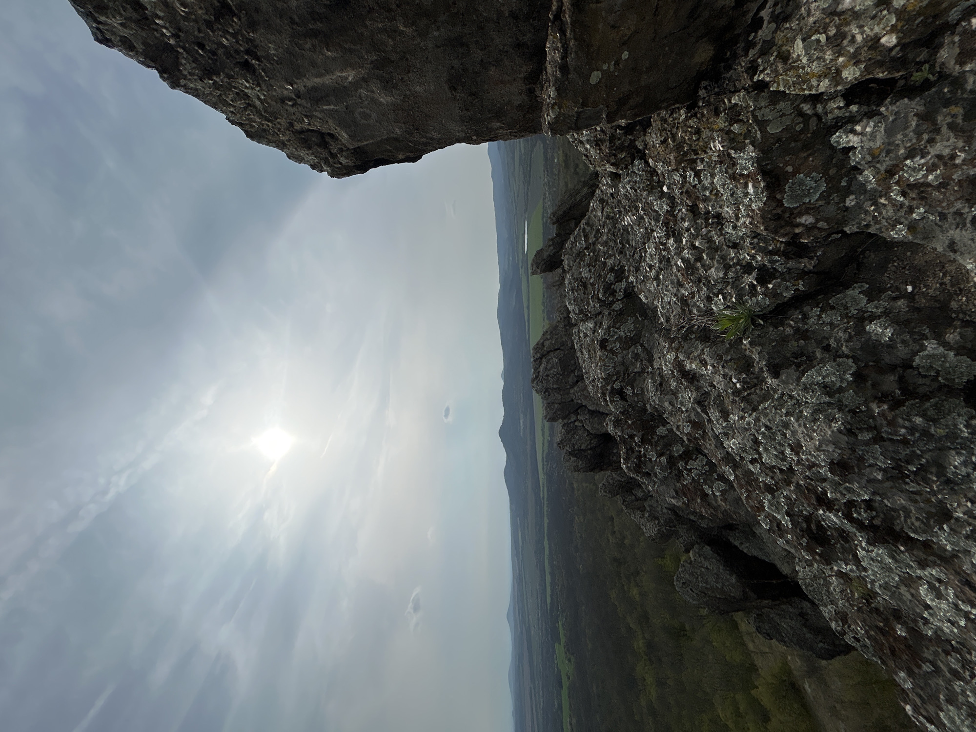 The image depicts a view from a high, rocky outcrop, possibly a cliff or mountaintop. The foreground features the rough, textured surface of the rock formation, with visible lichens and a small plant. A gap exists between two rock formations, framing a landscape that stretches towards the horizon. The landscape includes a mix of fields, forests, and distant hills under a bright, cloudy sky with the sun shining through. The exact location cannot be determined from the visual information provided.