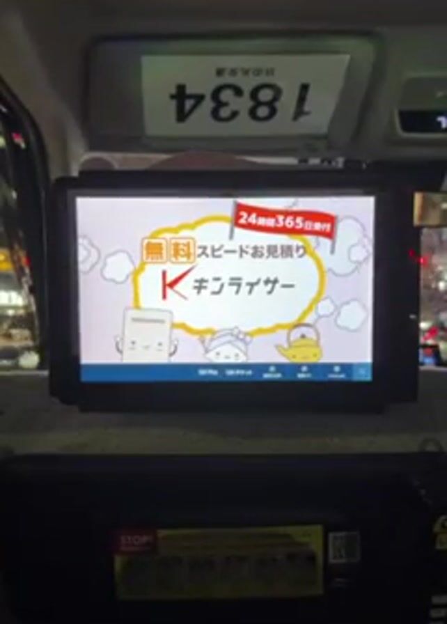 inside of a taxi, with a small screen mounted on the back of the front seat displaying an advertisement. The advertisement is in Japanese and features cartoon characters. Above the screen is the taxi's registration number. The environment appears to be at night, with blurred city lights visible through the window. There are no people visible in the video.