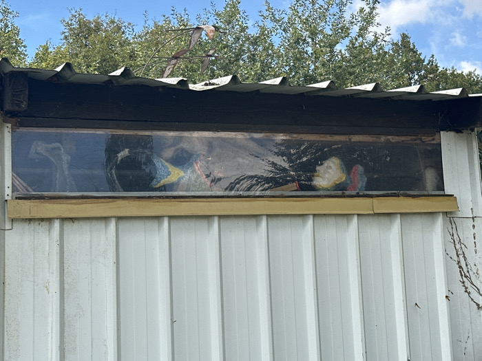 The image displays the exterior of a structure in Chantepie, France, under natural light conditions. The lower half of the frame features a white, vertically corrugated metal wall, exhibiting some staining. Above this wall, a narrow, horizontal window spans the width of the frame. The window features a dark brown top frame element and a lighter, yellowish-beige bottom frame. The window pane appears to be a flexible, transparent material, possibly plastic sheeting, showing distortions and reflections. Inside the window, multiple subjects are partially visible in a dimly lit interior. On the left, a light-colored, irregularly shaped object or sculpture is present. Towards the center-right, a darker, voluminous object shows patches of blue and yellow coloration. On the far right, a human-like head, possibly a mannequin or sculpted face, is visible. It features light-toned skin, what appears to be yellow hair, and an element of red on its lower portion, possibly a garment. Above the window, a dark-colored wooden beam structure supports a corrugated metal roof. On top of the roof, multiple thin, dark-colored metal sculptures, resembling abstract shapes or stylized birds, are positioned against the sky. The background consists of dense green tree foliage under a partly cloudy blue sky.