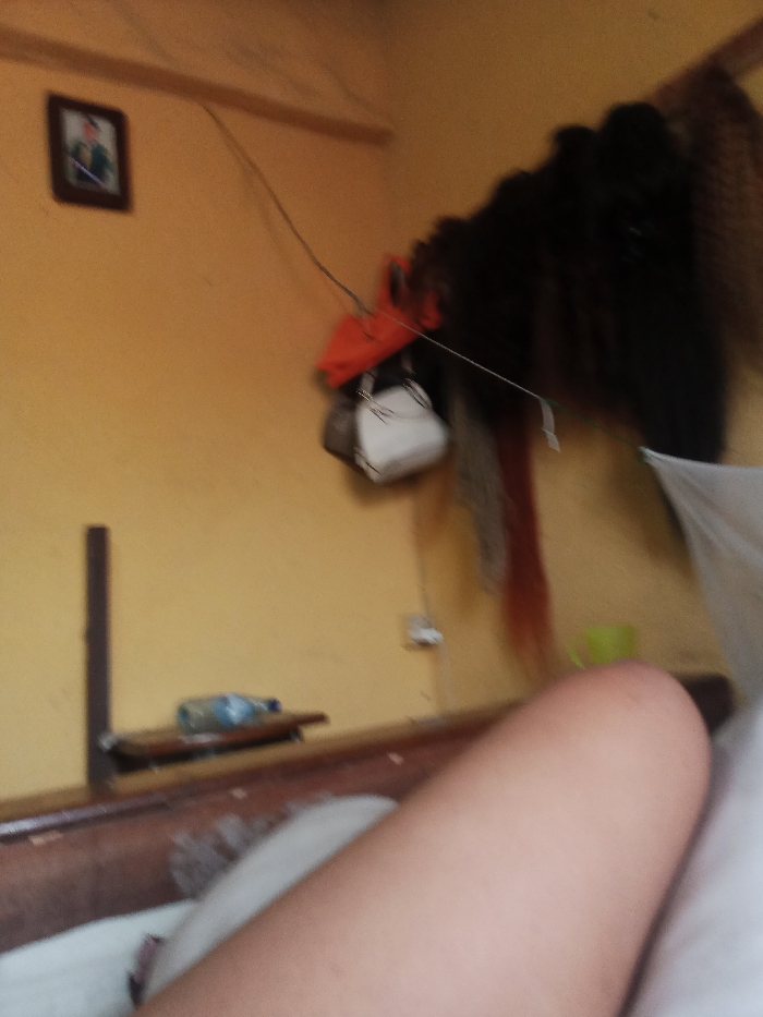 The image depicts an indoor scene, presumably within a dwelling in Agani, Nigeria. The foreground is dominated by a bare human leg, specifically the thigh and knee, resting on white bedding or fabric, indicating the perspective of someone lying down. The background consists of a light yellow-orange wall. On the upper left section of this wall, a framed portrait of a male figure, possibly in a uniform, is visible. A thin wire or string runs horizontally across the upper mid-section of the wall, from which several items are suspended: a white and brown handbag, an orange piece of fabric, and additional dark, indistinct textile items. A white electrical outlet is affixed to the lower right portion of the wall. Below the hanging items, a wooden shelf extends horizontally, upon which a clear plastic water bottle lies. A dark vertical wooden beam or post is present on the far left side of the frame, extending upwards from the bottom. A small, light green object, possibly a cup, is partially visible on the lower right.