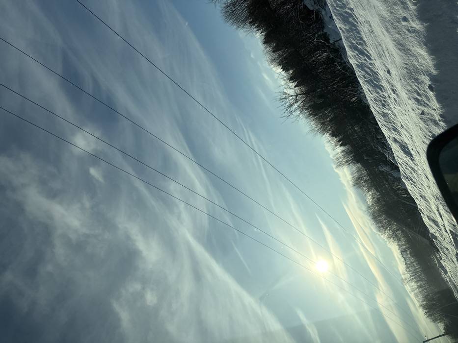 The image captures a bright, sunny winter scene from a vehicle. Wispy clouds stretch across a light blue sky, intersected by telephone wires. A bank of snow and a line of trees run along the upper right edge of the frame. The sun shines intensely near the horizon, creating a hazy effect. The side mirror of the vehicle can be seen on the right.