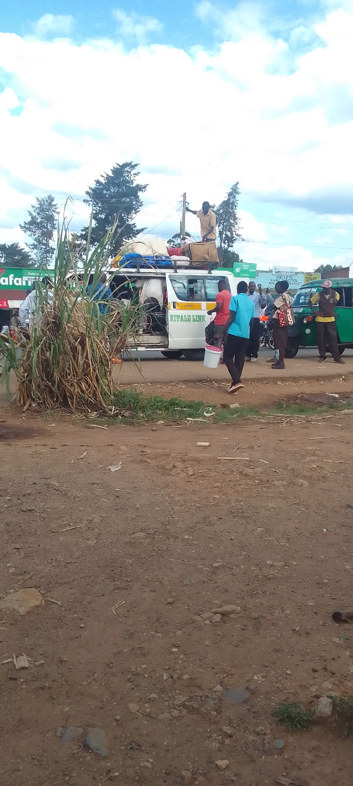 scene in Kakunga, Kenya, located at coordinates 0.377 latitude and 34.854 longitude. A white minivan with the words "KITALE LINK" written on the side is parked on a dirt road. The van is loaded with luggage and people are getting on and off of it. A man is standing on the roof of the van, working on a utility pole. There are at least 7 people in the scene, some are getting on or off the van while others are walking by. The people appear to be of African descent and are dressed in casual clothing. There is a large bush in the foreground and a blue sky with white clouds in the background. A sign for a business is visible in the background. The road surface is dusty and uneven. The scene is typical of a rural area in Kenya.