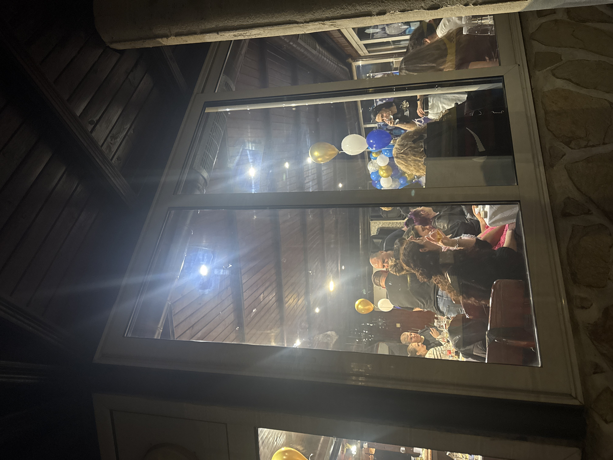 The image depicts a nighttime scene in Polikraishte, Bulgaria, looking through a window into an indoor gathering. A group of people are visible inside, seemingly at a celebration or event. Balloons, some gold, white, and blue, are present. The exterior of the window is framed by wooden beams and stonework. Inside, tables and chairs are visible, along with numerous individuals engaged in conversation and interactions.