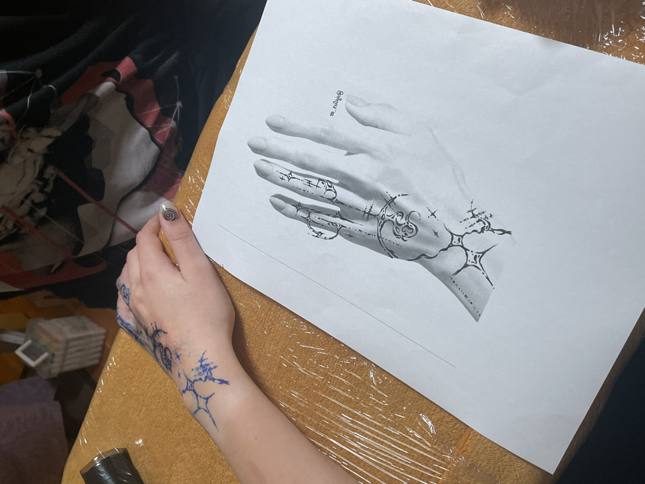 A person's arm and hand are positioned next to a printed image of a hand adorned with intricate jewelry-like designs and tattoos. The hand on the print and the person's actual hand are placed side by side, seemingly as a template for a tattoo. The person's hand and wrist already have some blue tattoo artwork that partially resembles the design in the printed image. A nail with a spiral design is visible. The scene is set on a surface covered in plastic wrap.