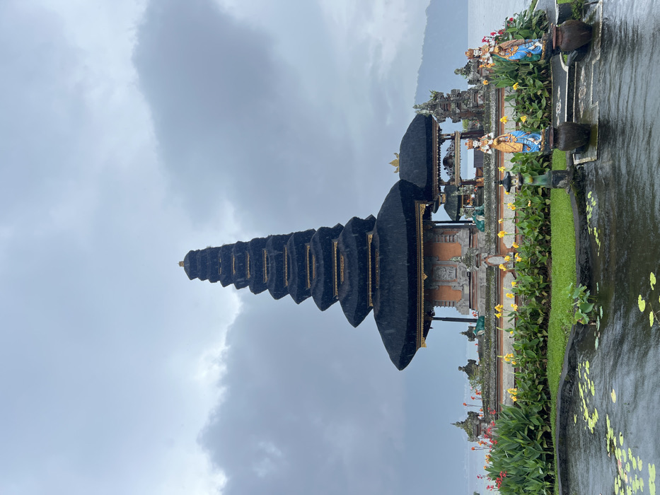 A tall, multi-tiered black temple structure dominates the scene against a cloudy sky. The temple is reflected in a body of water filled with lily pads. Statues and vibrant flowers line the waterfront, with other temple structures visible in the background. The image appears to be taken on a cloudy or rainy day, given the overcast sky and wet surfaces.