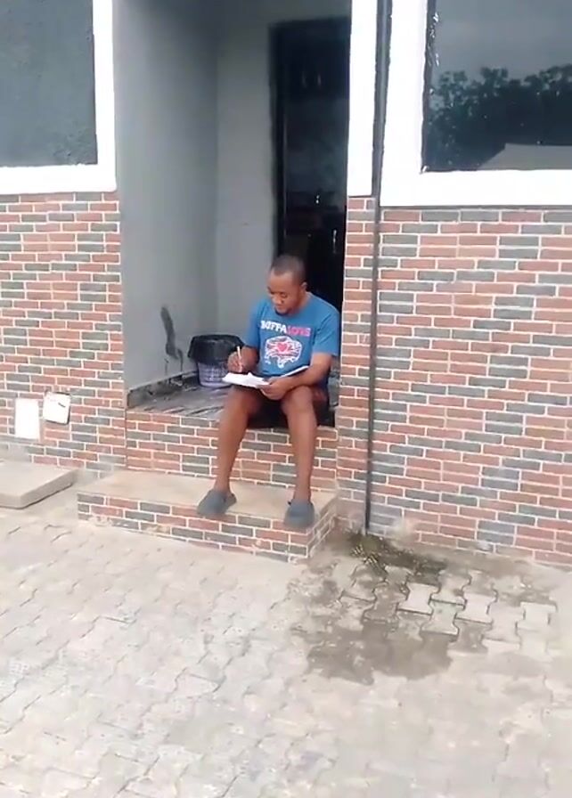 A medium-shot video shows a man sitting on the steps of a brick porch, writing on a piece of paper