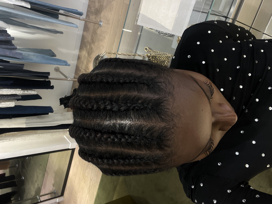 An overhead image depicts an individual with dark skin, their hair styled into seven distinct cornrows running from front to back