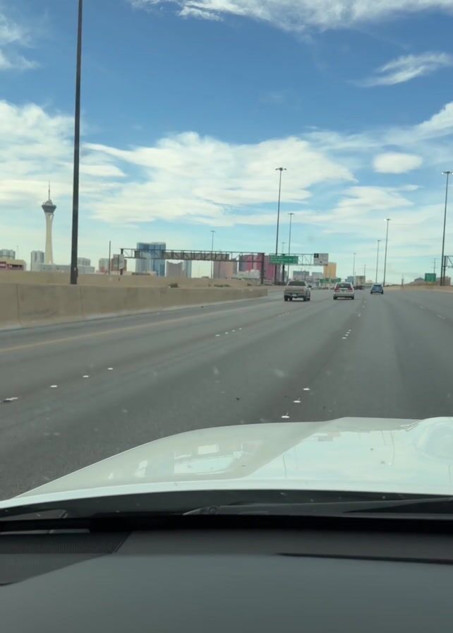 - "A forward-facing dashcam view shows a white car driving on a highway in Las Vegas on a bright day with a blue sky and scattered clouds" by FM-tkWVU2, licensed under CC BY 4.0