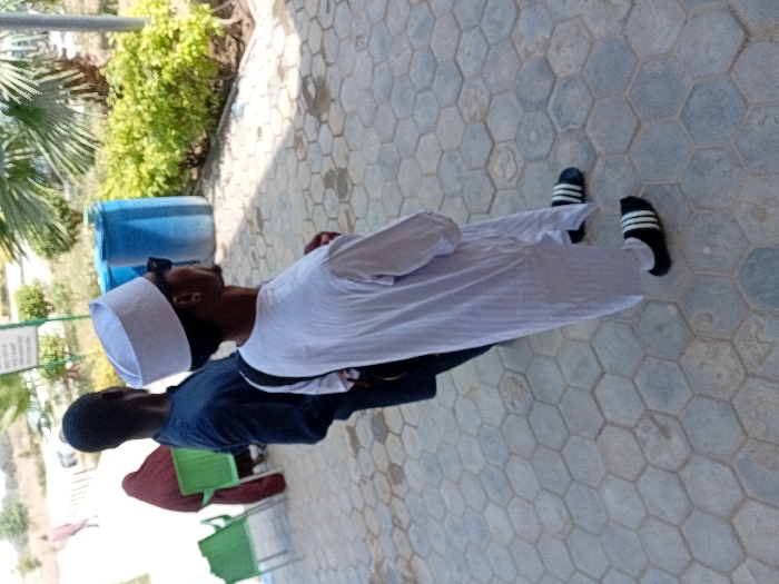 The image displays an outdoor scene in Kwazailewa, Nigeria, under clear daylight. The ground is paved with hexagonal grey interlocking tiles. In the mid-foreground, a male individual, appearing to be of African descent, stands in profile facing to the right. He wears a white kufi cap, dark sunglasses, a long white tunic, and black Adidas slides with white stripes. A dark strap, possibly from a bag, is visible over his left shoulder. Behind this individual and slightly to the left stands another male figure, also appearing to be of African descent, with his back to the viewer. He is dressed in a dark blue long-sleeved top and dark trousers. In the background, to the left, a third person is seated on a light green plastic chair. This individual is covered in a loose, reddish-brown garment. An identical unoccupied light green plastic chair is positioned next to them. In the far background, a blurred figure in light clothing walks away on what appears to be a dirt path. To the right in the background, two blue plastic barrels are visible adjacent to green shrubbery and a small palm tree. A white sign with green trim, featuring illegible text, is also present. The environment is sparsely vegetated with dry areas in the far distance.