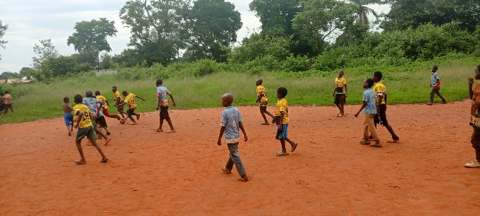 A group of children plays on a dirt field, with lush green trees in the background. Some of the children are wearing yellow shirts with black accents, while others are in colorful clothing. A few figures are walking along the edge of the field. The ground is a reddish-brown color. The sky is overcast.