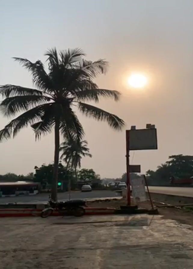 tropical scene during the day with a hazy sky and the sun visible in the upper right. A tall palm tree is on the left, partially obscuring the sun. A roadside area is visible in the foreground with a parked motorcycle and a signpost. In the background, there's a gas station, some buildings, and a road with cars driving on it. The overall lighting is bright but diffused due to the haze.