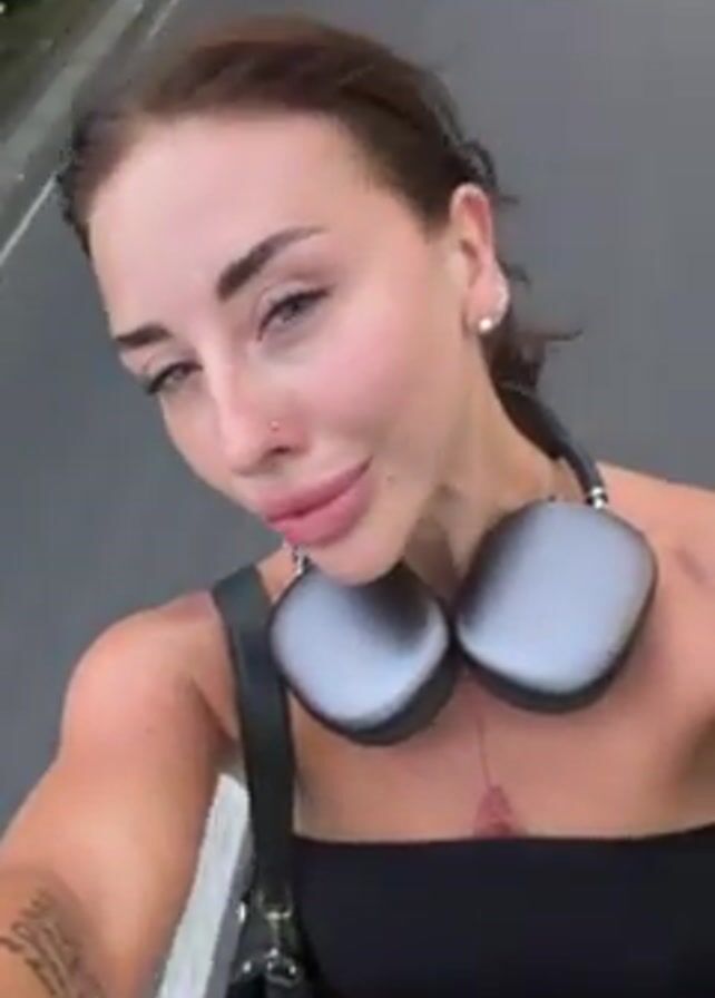 The video features a woman on a road, seemingly taking a selfie video. She is wearing a black strapless top and has grey headphones around her neck. She has tattoos on her left arm and a nose piercing. The camera moves with her as she appears to be walking, possibly on a scooter. Background includes road traffic, buildings, and a storefront with "Fresh Clean" sign. The overall lighting suggests it's daytime.